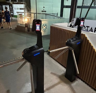 Tecnologia integrada com catracas, QR Code, reconhecimento facial e cartões.